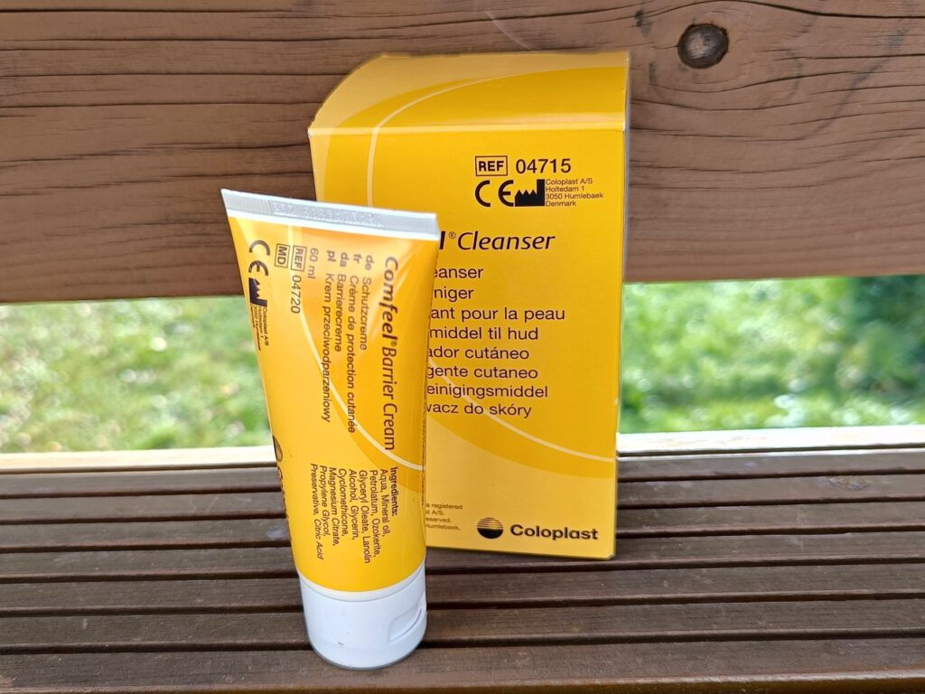Coloplast – płyn wspomagający odklejanie i krem przeciwodparzeniowy.