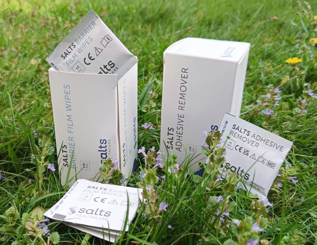 Salts – chusteczki do oczyszczania skóry i te nasączone preparatem ochronnym. Te pierwsze czynią skórę wolną od treści jelitowej, resztek kleju i pasty stomijnej, podczas gdy drugie nakładają na nią ochronny film stanowiący wsparcie podczas przypadkowego kontaktu z treścią wydobywającą się ze stomii i podciekającej pod płytkę.
