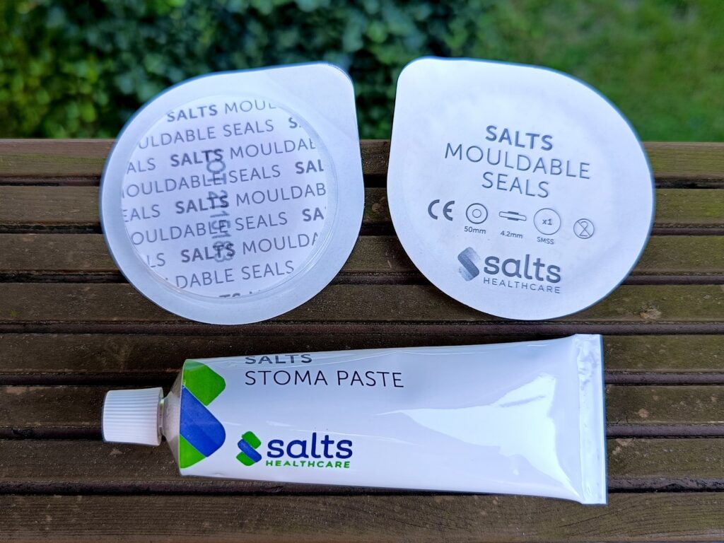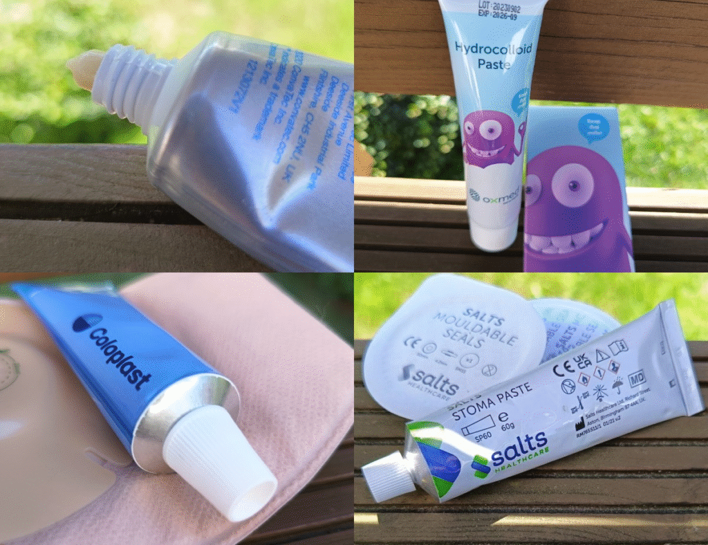 W artykule opisano i użyto zdjęć prezentujących pierścienie hydrokoloidowe do uszczelniania stomii oraz pastę stomijną.