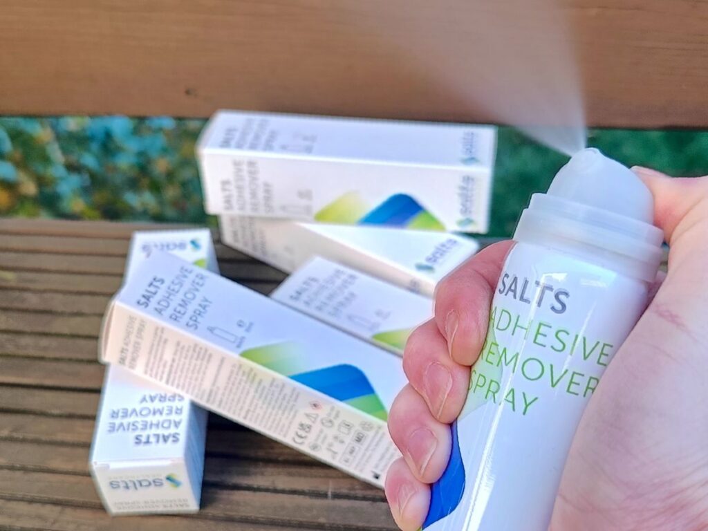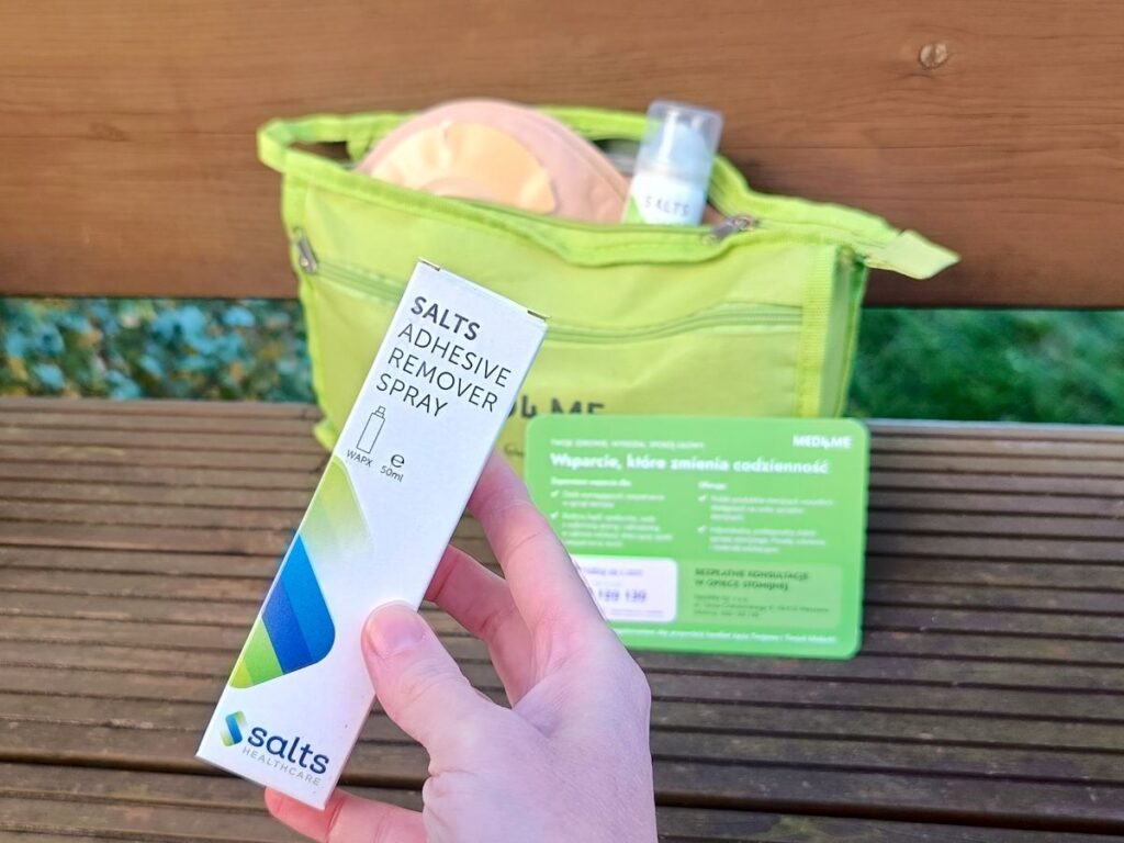 – Nie przyspieszaj procesu. Odklejacz działa szybko, ale potrzebuje kilku sekund na to, by substancja wspomagająca odklejanie mogła zadziałać. Natryśnij w miejsce, gdzie ma działać, odczekaj kilka sekund i powoli odklejaj płytkę. Powtarzaj tę czynność w chwili, gdy płytka „trzyma” mocniej. Przy pomocy chusteczki usuń pozostałości pasty i treści jelitowej. Dopiero na tak przygotowaną skórę nałóż nową płytkę.