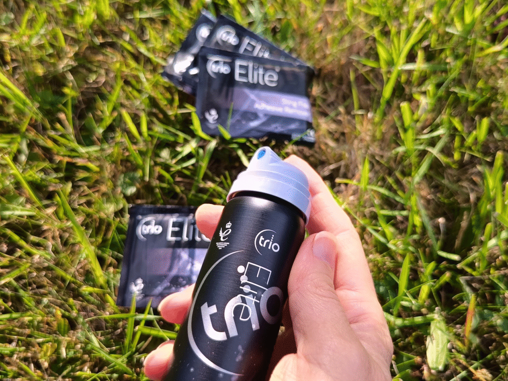 na zdjęciu produkty marki Trio (Oakmed): odklejacz – remover, spray wspomagający odklejanie zużytego woreczka. W drugim planie – ten sam produkt w opcji: chusteczki. Mogą być stosowane zamiennie.