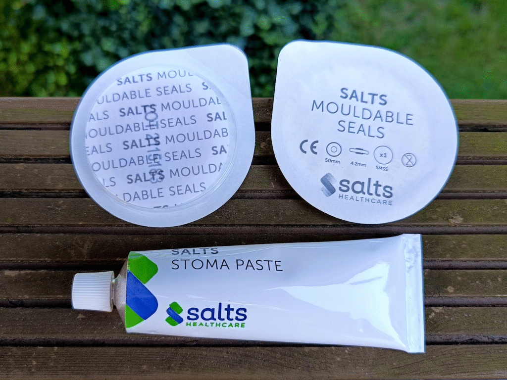 na zdjęciu produkty marki Salts: pasta uszczelniająca i hydrokoloidowe pierścienie uszczelniające. Chronią skórę przed skutkami kontaktu z treścią jelitową. Nie do przecenienia w stomii z tendencją do podciekającej.